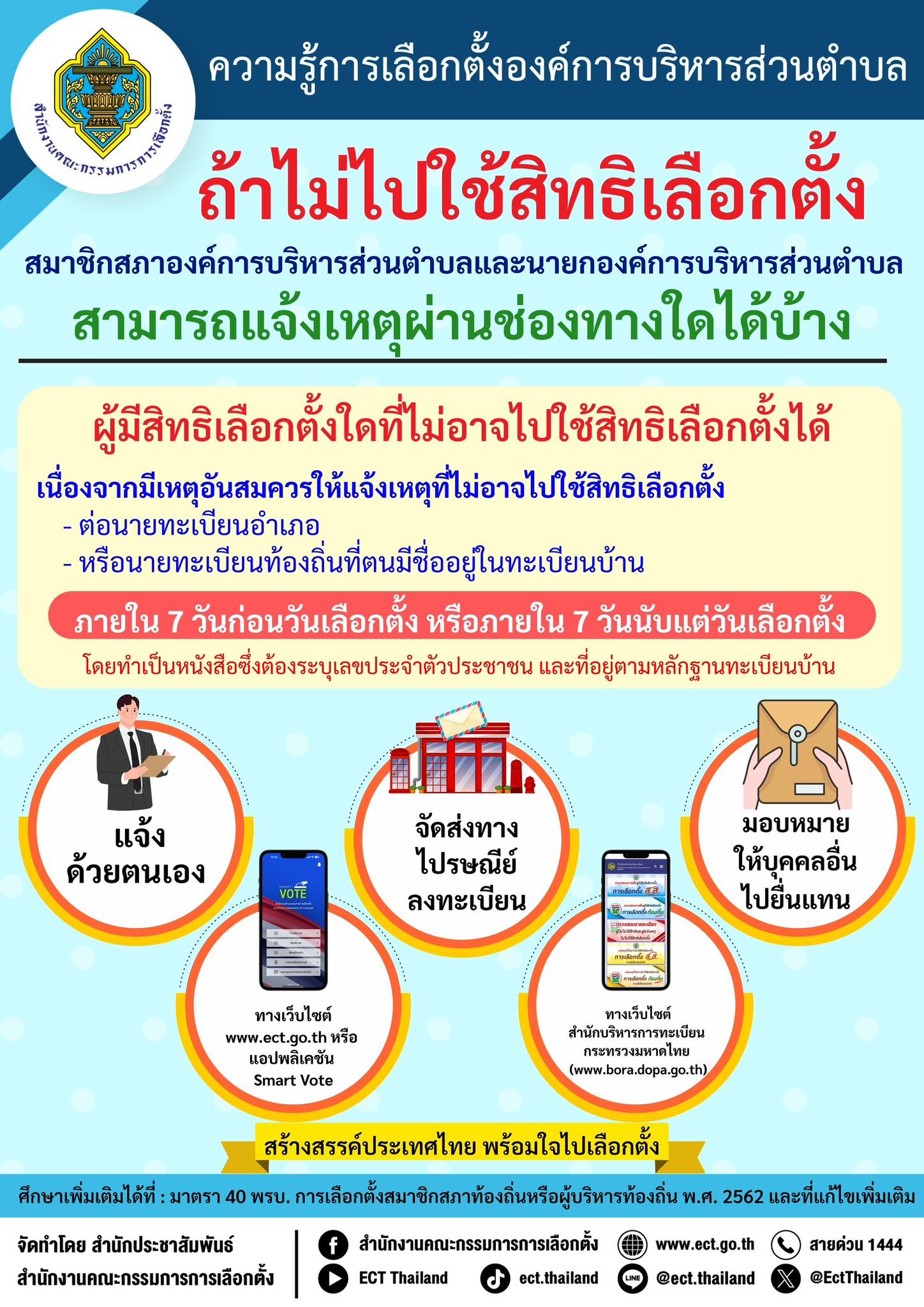 ประชาสัมพันธ์ ช่องทางการแจ้งเหตุไม่ไปใช้สิทธิ์เลือกตั้งสมาชิกองค์การบริหารส่วนตำบล และนายกองค์การบริหารส่วนตำบล |